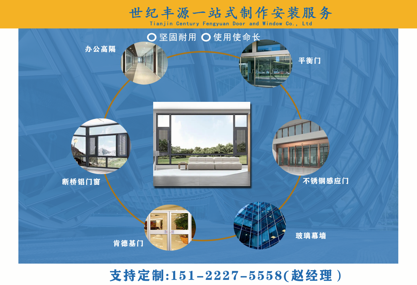 天津世紀(jì)豐源門窗有限公司從事斷橋鋁門窗,玻璃幕墻,平衡門,肯德基門,不銹鋼感應(yīng)門,百葉窗,辦公高隔,制作安裝一站式訂制生產(chǎn)及配套服務(wù)等。 公司自成立以來,始終堅(jiān)持以人才為本、誠信立業(yè)的經(jīng)營原則,薈萃業(yè)界精英,成熟的技術(shù)、管理方法及企業(yè)經(jīng)驗(yàn)與國內(nèi)企業(yè)的具體實(shí)際相結(jié)合,為企業(yè)供給各個(gè)方面的解決方案,使企業(yè)在激烈的市場競爭中始終堅(jiān)持競爭力,實(shí)現(xiàn)企業(yè)快速、穩(wěn)定地發(fā)展。 質(zhì)量好、服務(wù)好、才能信譽(yù)好,公司已在諸多領(lǐng)域取得輝煌成績,愿意成為您可信賴的長期合作伙伴。 讓我們攜手同行,共同實(shí)現(xiàn)“讓普通老百姓都用得上高端門窗”...